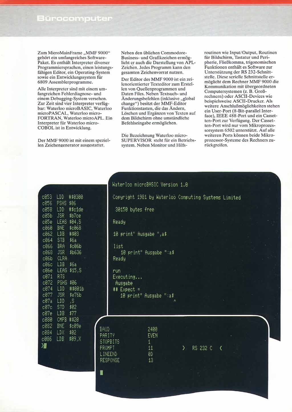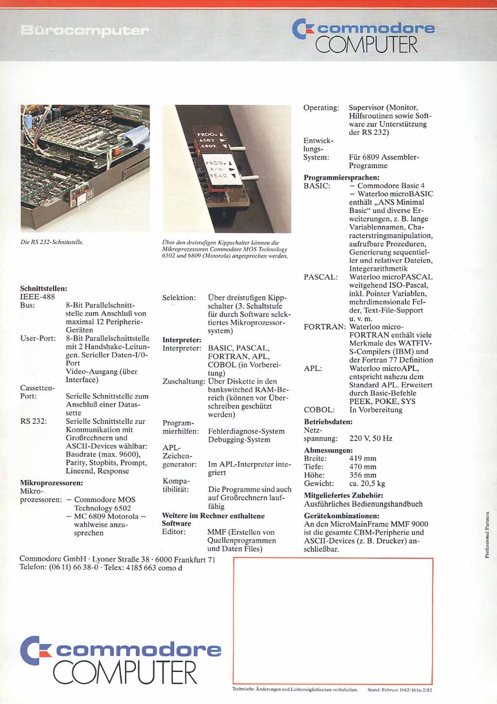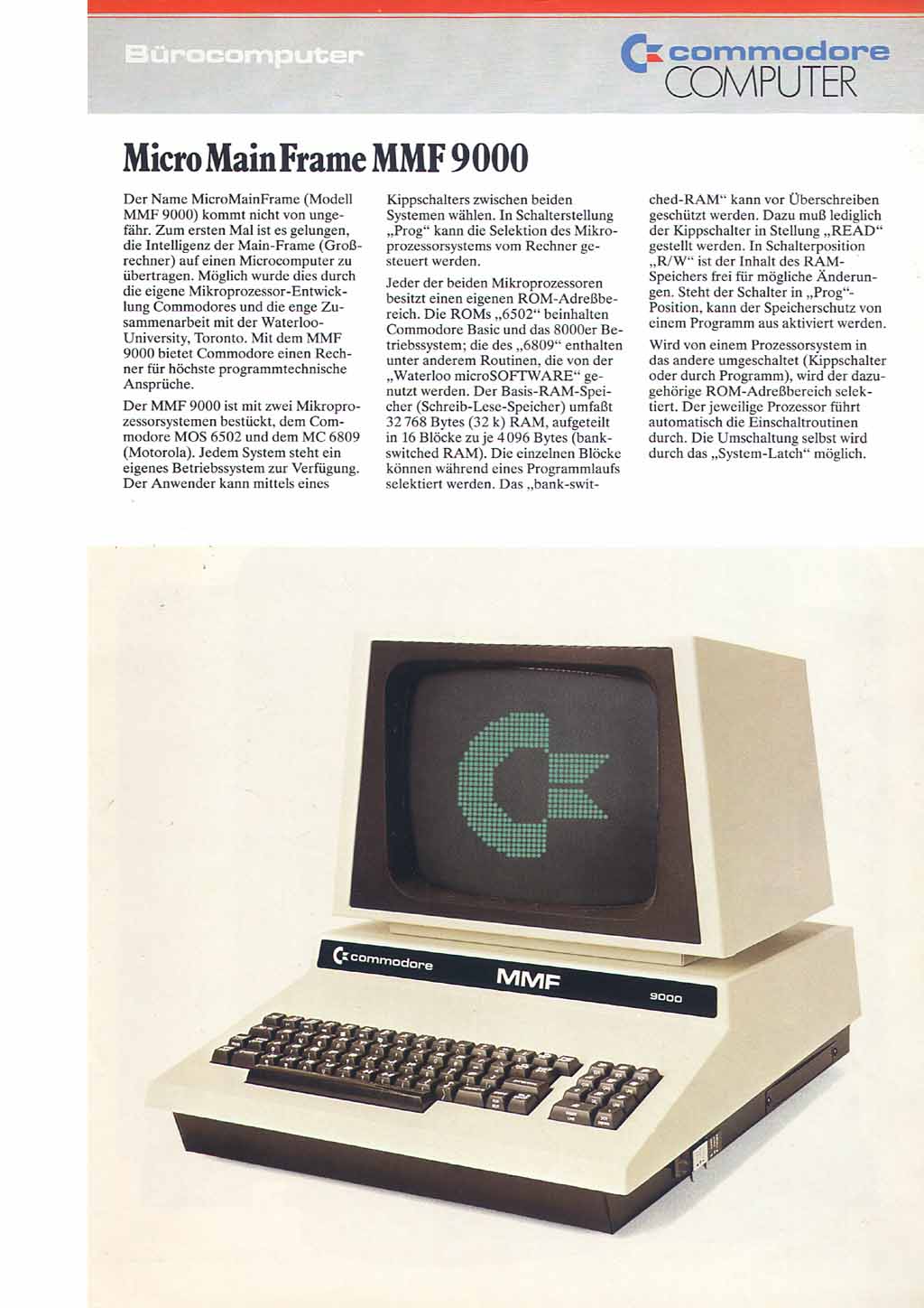 Der "SuperPET", in Deutschland aufgrund schon obengenannter lizenzrechtlicher Probleme mit der Firma Philips "MMF 9000" genannt, war das erste Mehrprozessorsystem Commodores und bildete die Krönung der CBM-1-Computer mit eckigem Gehäuse. Er beherbergte sowohl den für diese Rechner typischen MOS6502, als auch den von Motorola gefertigten MC6809. Diese Maschine kann als "intelligentes" Terminal für den Einsatz an Großrechensystemen angesehen werden, wofür auch die RS232-Schnittstelle und die mitgelieferten Hochsprachen-Interpreter sprechen. Diese wurden von der Waterloo-Universität in Toronto (Kanada) geliefert und bestanden aus den Sprachen APL, Cobol, Fortran, Pascal, einem zusätzlich zu dem im ROM vorhandenen Basic, sowie einem komfortablen Assembler. Interessant an den in Deutschland ausgelieferten Handbüchern ist, daß zwar die englischsprachigen Originalhandbücher verwandt wurden, aber der Name "SuperPET" in Handarbeit mit Aufklebern auf den Titelseiten in "MMF 9000" geändert und auf den übrigen Seiten vollständig mit Schreibmaschinen-Korrekturflüssigkeit (TipEx) entfernt wurde.
