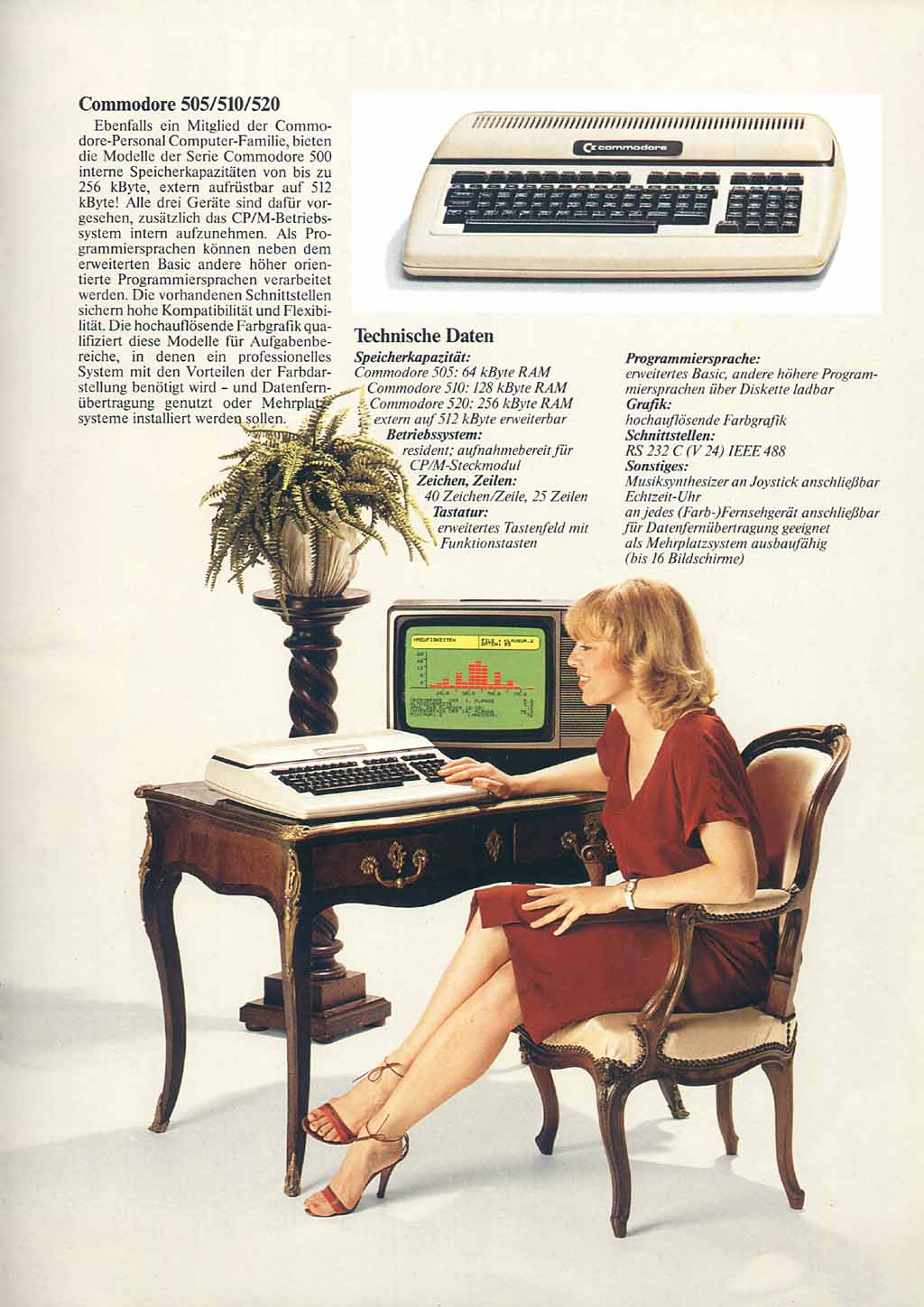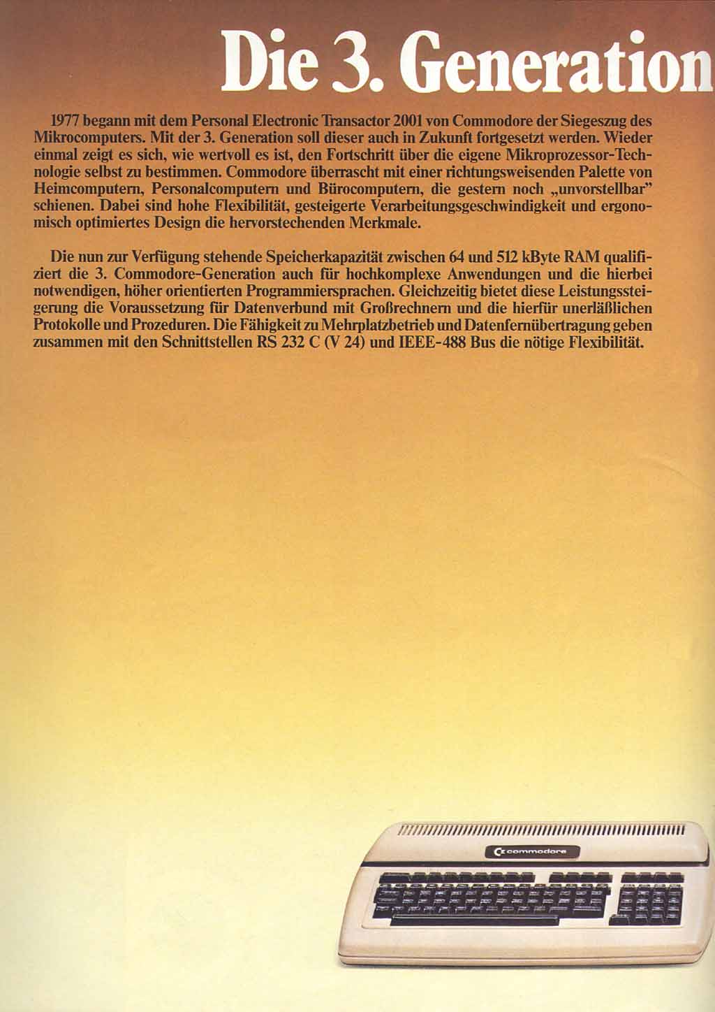Auch die abgebildeten CBM7xx-Rechner sind Muster ohne Wert! Abgesehen davon, daß die später tatsächlich erschienenen Geräte eine etwas andere Form besaßen, erkennt man bei genauerem Hinsehen, daß die eingebauten Doppellaufwerke nur aufgesetzte Blenden sind. Merkwürdigerweise zeigen die Abbildungen den bekannten Monochrom-Bildschirm, im Werbetext wird aber mehrfach auf "hochauflösende" Farbgrafik hingewiesen. Das im Text angesprochene CP/M-Modul bestand später aus einer Tochterplatine mit 8088-Prozessor, die dann (warum wohl?) als "MS-DOS"-fähig angepriesen wurde. Diese Platine war scheinbar zwar erhältlich, fiel aber dann, ebenso wie die Doppellaufwerke, einer "low cost"-Variante dieses Rechnertyps zum Opfer.