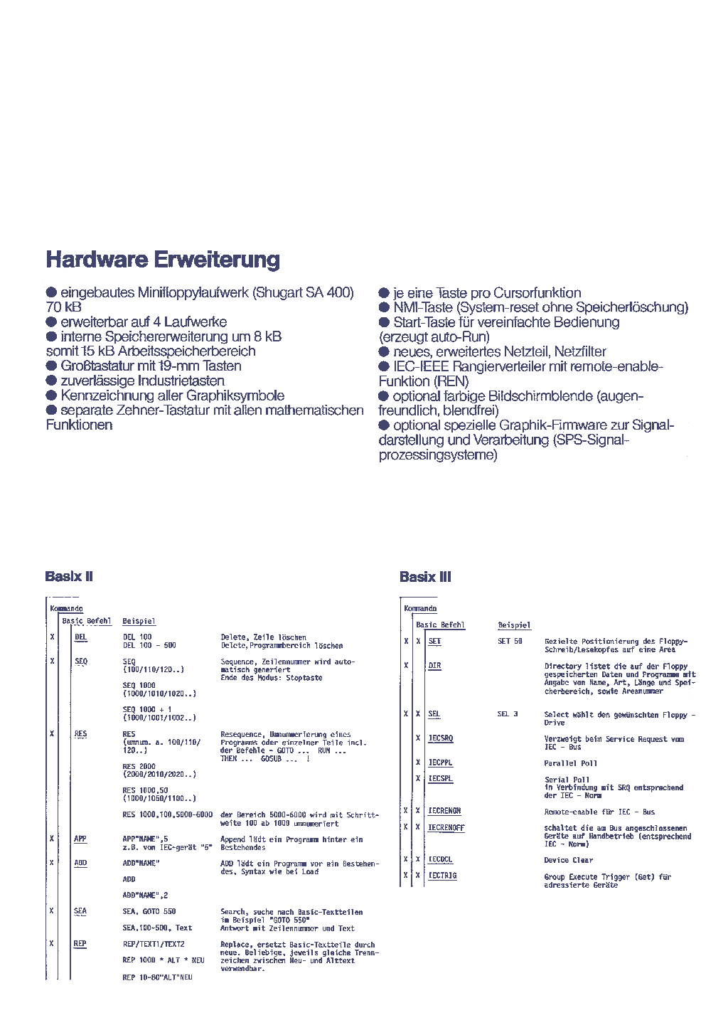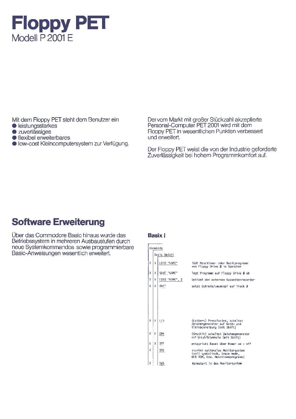 Here you see a PET2001 as a conversion made by "Systec" (Munich) with enlarged keyboard, integrated floppy drive and seperated! cursor-keys. Mark the "gigantic" memory capacity of the disk drive (Page 3)!