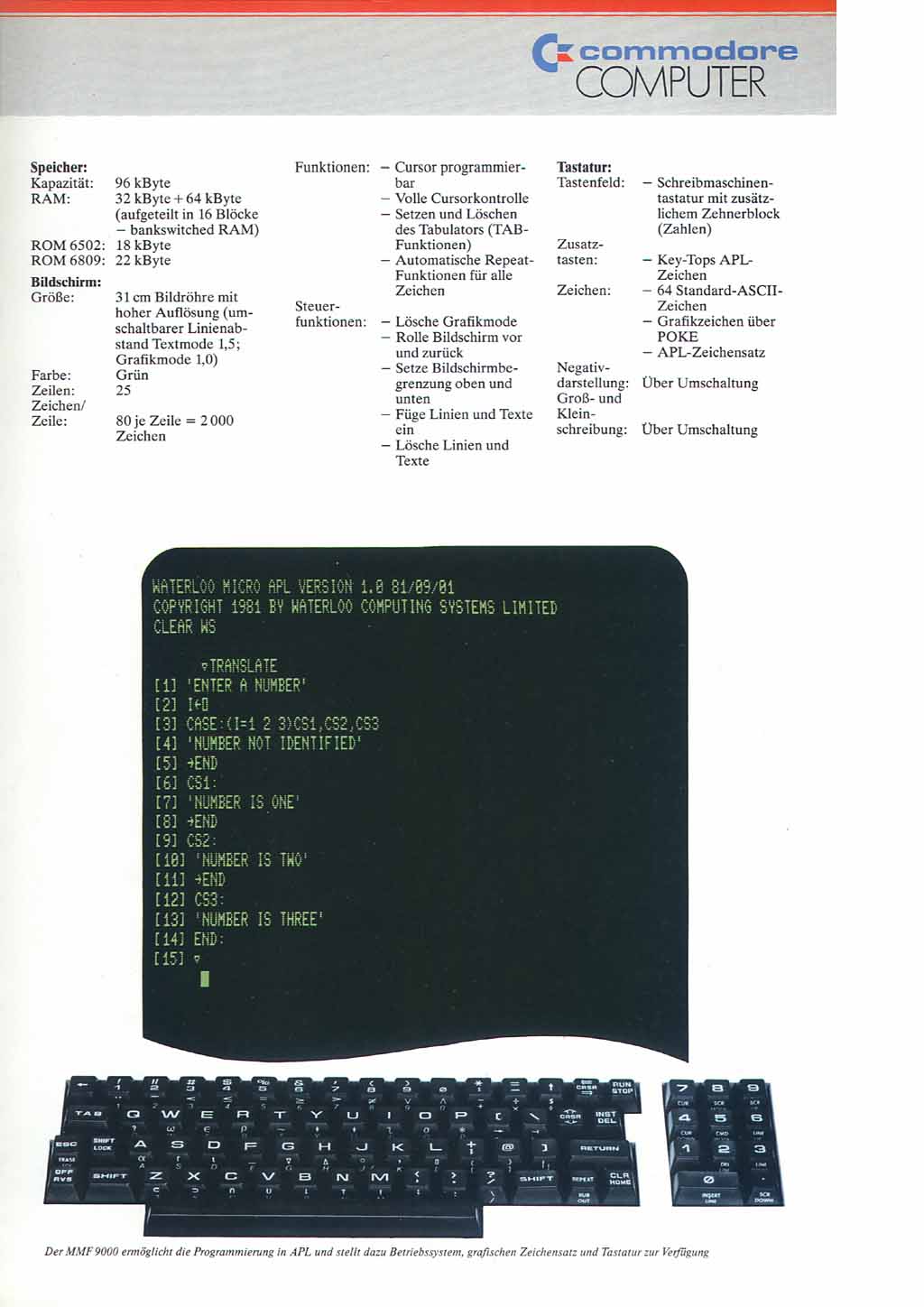 Der "SuperPET", in Deutschland aufgrund schon obengenannter lizenzrechtlicher Probleme mit der Firma Philips "MMF 9000" genannt, war das erste Mehrprozessorsystem Commodores und bildete die Krönung der CBM-1-Computer mit eckigem Gehäuse. Er beherbergte sowohl den für diese Rechner typischen MOS6502, als auch den von Motorola gefertigten MC6809. Diese Maschine kann als "intelligentes" Terminal für den Einsatz an Großrechensystemen angesehen werden, wofür auch die RS232-Schnittstelle und die mitgelieferten Hochsprachen-Interpreter sprechen. Diese wurden von der Waterloo-Universität in Toronto (Kanada) geliefert und bestanden aus den Sprachen APL, Cobol, Fortran, Pascal, einem zusätzlich zu dem im ROM vorhandenen Basic, sowie einem komfortablen Assembler. Interessant an den in Deutschland ausgelieferten Handbüchern ist, daß zwar die englischsprachigen Originalhandbücher verwandt wurden, aber der Name "SuperPET" in Handarbeit mit Aufklebern auf den Titelseiten in "MMF 9000" geändert und auf den übrigen Seiten vollständig mit Schreibmaschinen-Korrekturflüssigkeit (TipEx) entfernt wurde.