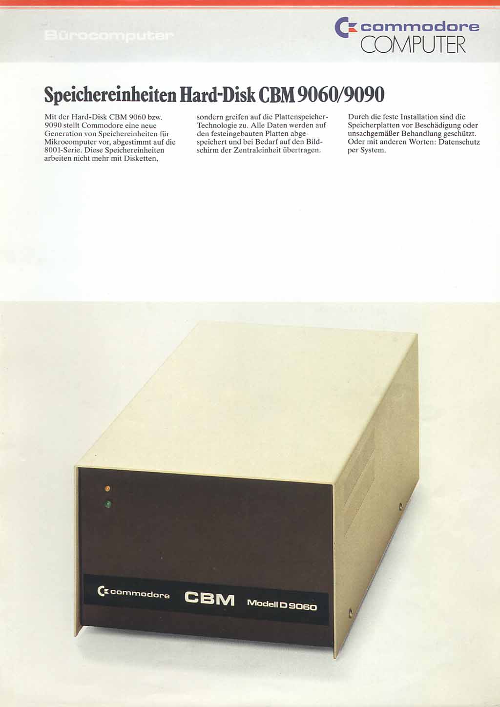 Die Modelle CBM 9060 und 9090 waren die einzigen von Commodore für den 8-Bit Bereich hergestellten Festplatten. Sie besaßen die "gigantische" Speicherkapazität von 5 bzw. 7,5 MB!, konnten die Daten nur in 1 Verzeichnis schreiben und benötigten ca. 1 Minute, bis sich nach dem Einschalten die Drehzahl soweit stabilisiert hatte, daß das Laufwerk "ready" war.