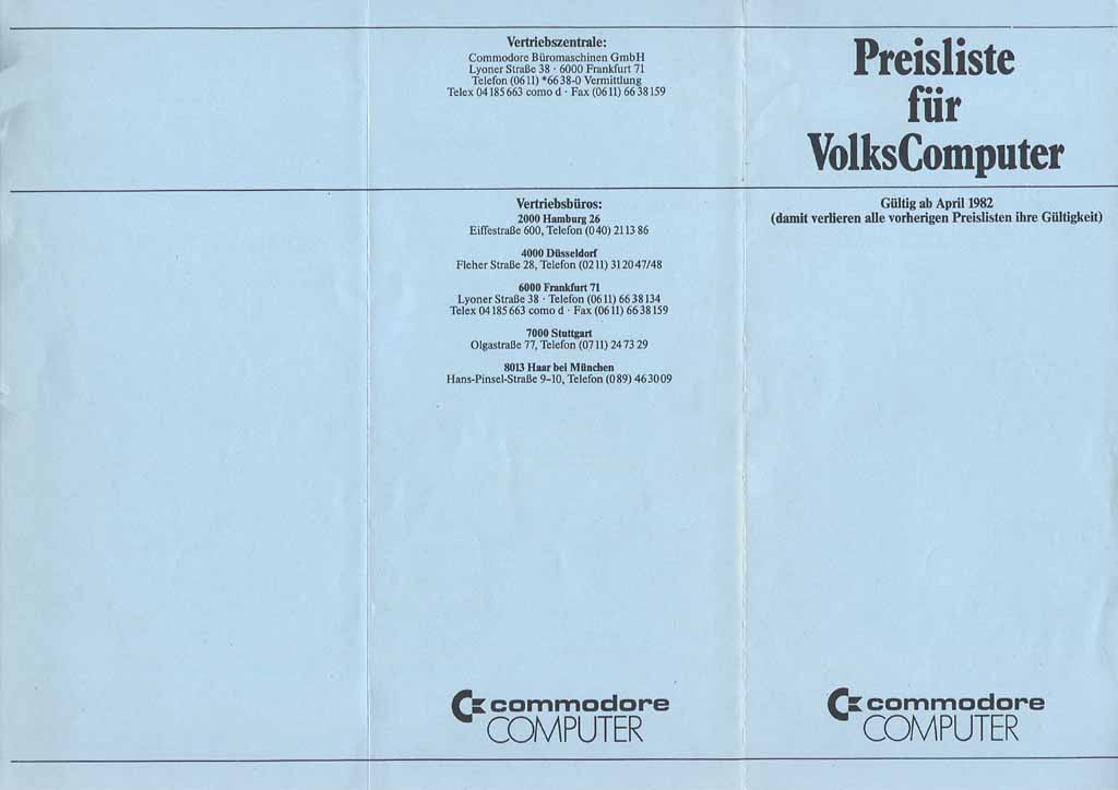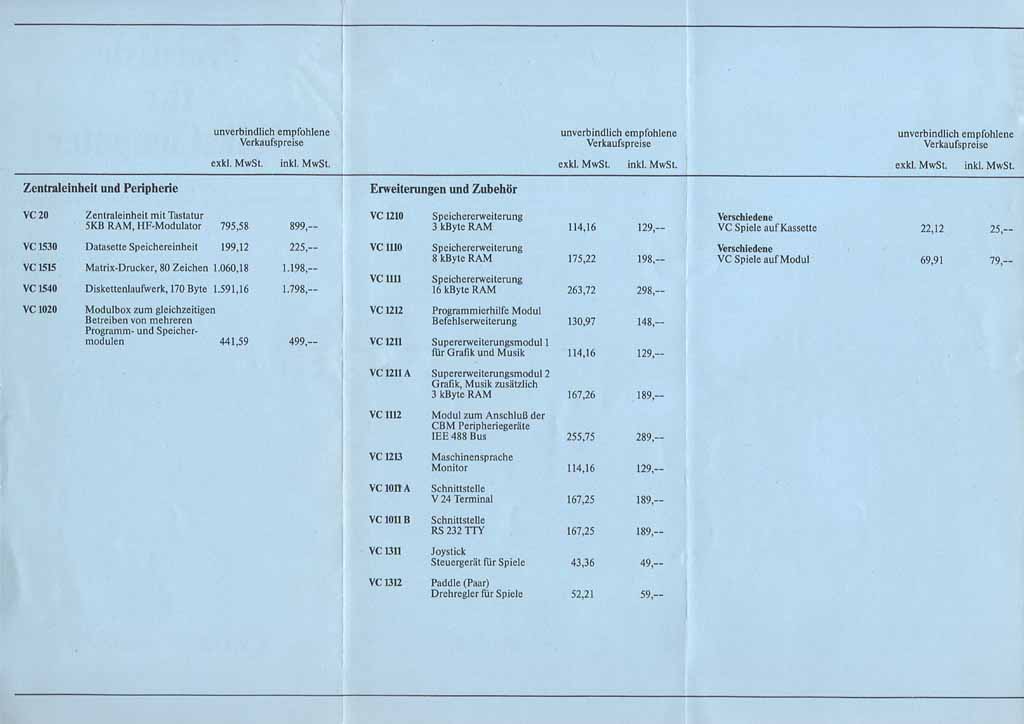 Diese Preisliste für den V(I)C20 ist ein besonderes Dokument. Aus heutiger Sicht ist es unvorstellbar, wieviel Computer und das Zubehör damals gekostet haben.